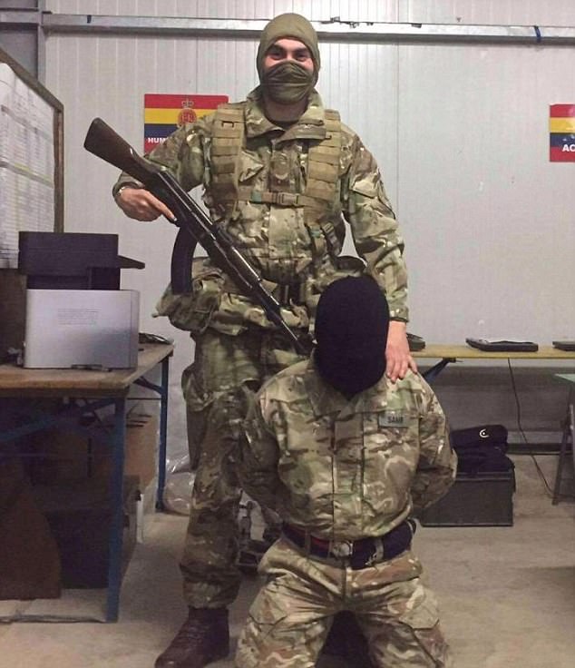 A British soldier training to become an officer at Sandhurst has been photographed holding a machine gun to a man's head in a sick mock ISIS execution.