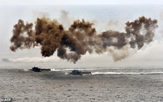 Attack helicopters fired missiles and jet fighters including eight F-16s dropped bombs in the waters south of the archipelago to 'repel the enemy.'