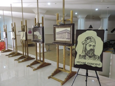 Portrait of the great Azerbaijani poet Nizami Ganjavi and coat of arms of Ganja city made of chocolate for the exhibition organized in Ganja.