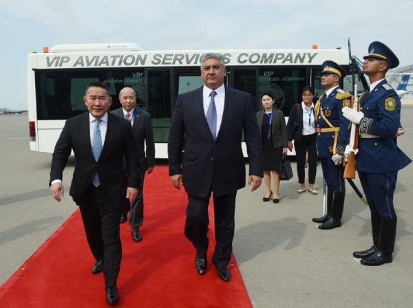 Mongolian President Khaltmaagiin Battulga was welcomed by Azerbaijani Minister of Youth and Sports Azad Rahimov and other officials.