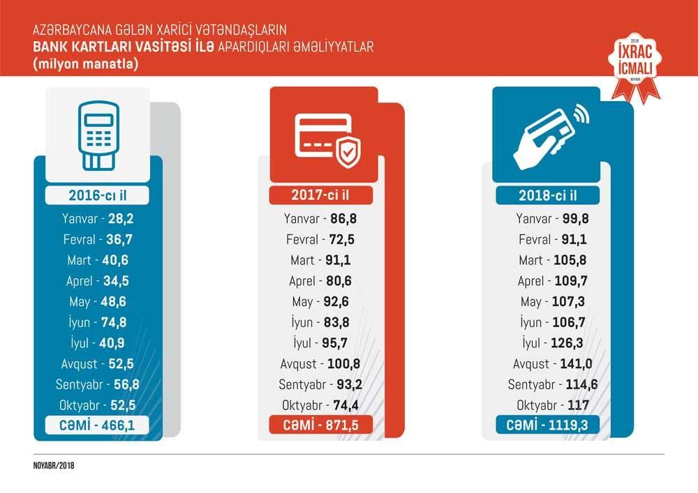In October 2018, the foreigners spent AZN 117 million for operations via bank cards, up 57% by contrast to 2017.