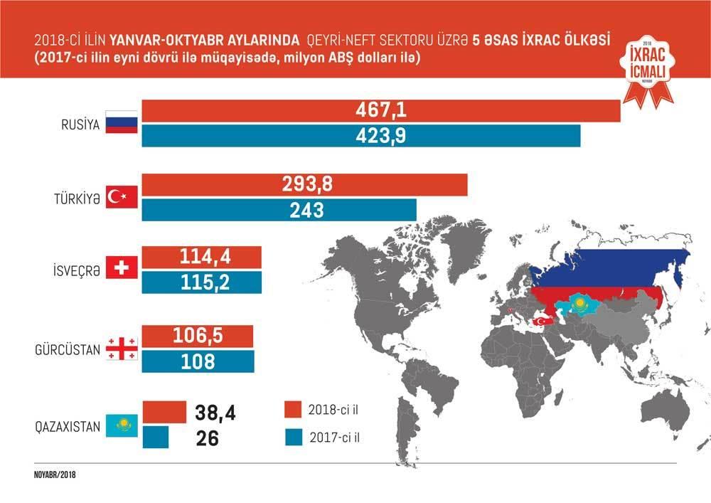 In October 2018, the export on non-oil products amounted to $144 million. Russia imported products worth $64.9 million, Turkey $18.2 million, Switzerland $9.2 million, Georgia $9.1 million, Ukraine $7.3 million.
