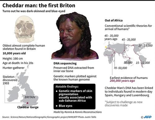 "It is very surprising that a Brit 10,000 years ago could have that combination of very blue eyes but really dark skin," said the museum's Chris Stringer, who for the past decade has analyzed the bones of people found in the cave.