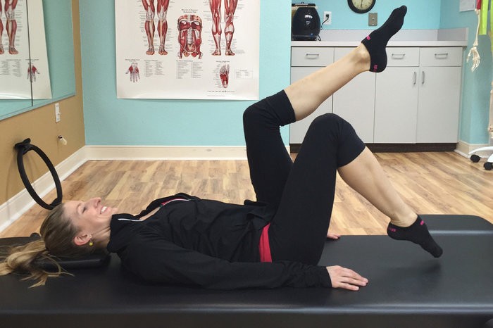“Lie on your back with your knees bent and feet flat, arms long by your side. Draw your navel to your spine. Imagine a pulley between your low abdominals, the space just inside your hip bones, and your right knee. On an inhale, bring your right leg up to tabletop, where your knee is just over your hip and your shin is parallel to the floor. On an exhale, lower the foot back to the ground. Repeat on the other side.”