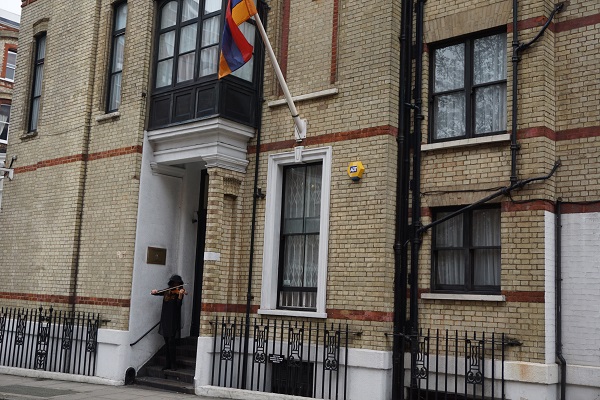 Despite the right to peacefully demonstrate on the streets of London being enshrined in UK law, one Armenian diplomat emerged from inside the Embassy and objected noisily – at one stage even reaching out as though to grab the violin. After Jack Pegoraro, Head, London Office, The European Azerbaijan Society (TEAS), explained about the remembrance, the Armenian diplomat disputed the occupation of Azerbaijani territory by the armed forces of his country and carried out his threat to call the police. The policeman who responded to the complaint understood the nature of the demonstration, replying: