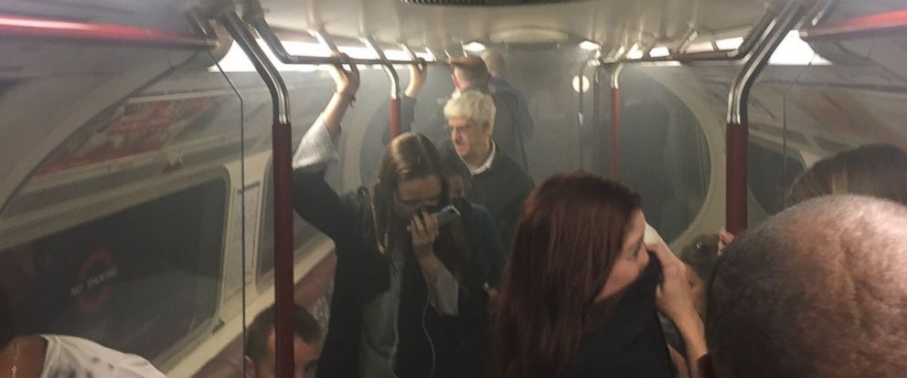 Photos posted by Twitter users show passengers covering their faces as the train carriage fills with smoke.