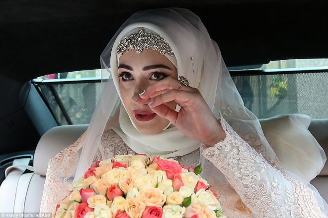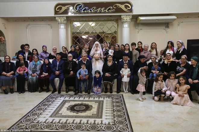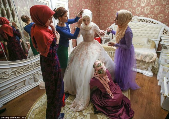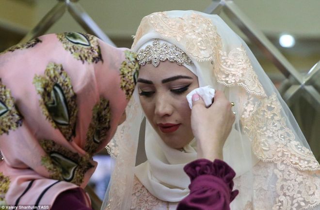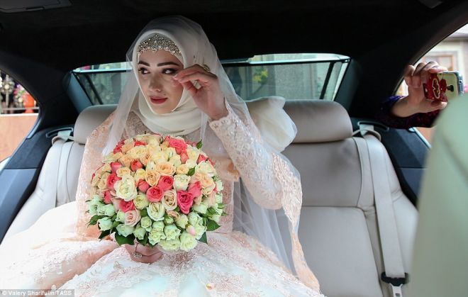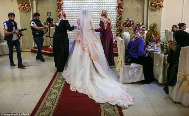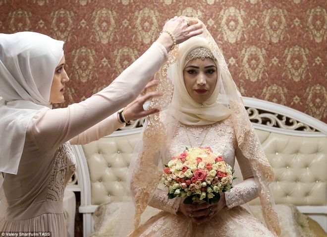 Before the ceremony in the Chechen capital of Grozny, the bride is pictured getting ready for her big day with her friends and family. After her hair is styled and her make up perfectly applied, she then puts on her ornate lace dress complete with delicate jewels on her veil. And as Chechen weddings are traditionally paid for by the groom and attended by his family members only, once ready the bride must wait to be collected.