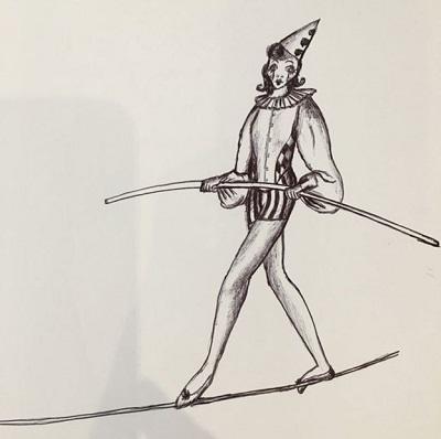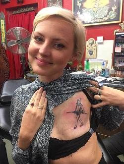 A tightrope artist walks along the line created by Kris Hallenga's mastectomy scar.