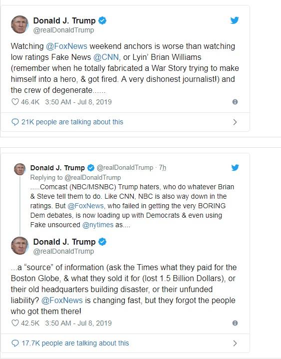 US President has laid into Fox News in a series of tweets, saying the news network is “loading up with Democrats” and forgetting "the people who got them there."