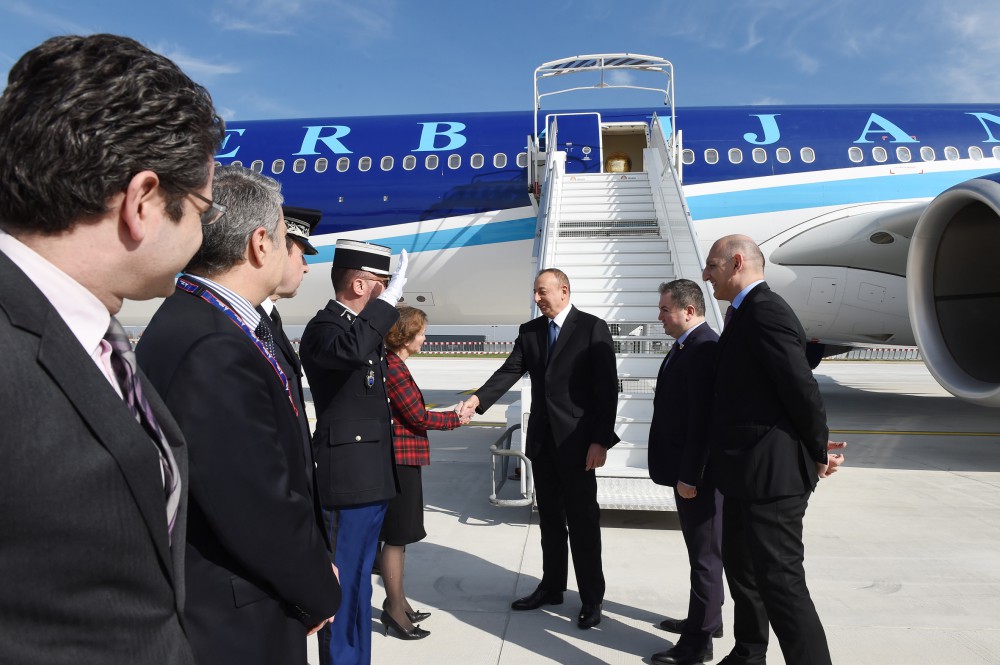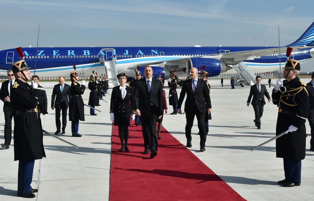 Axar.az reports guards of honor was lined up in International Airport Orli in Paris where Azerbaijani and France flags were decorated.