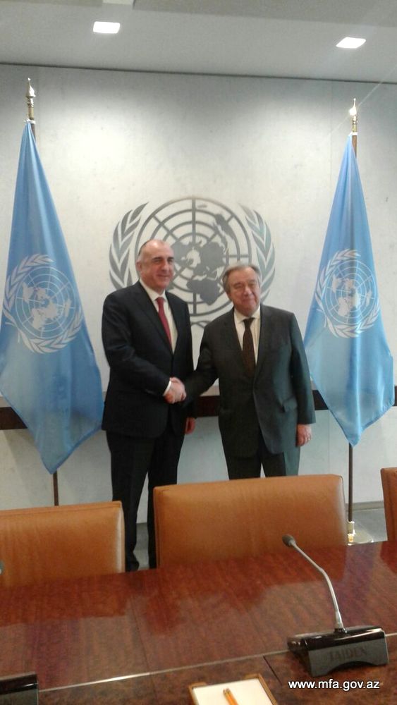 Azerbaijani Foreign Minister Elmar Mammadyarov met with UN Secretary General Antonio Guterres during his visit to New York to attend ceremonies which were held for the 25th anniversary of the membership of Azerbaijan to UN.