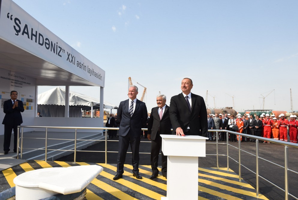 Azerbaijani President Ilham Aliyev attended a ceremony as the jacket for one of the Shahdeniz stage 2 platforms has sailed away from the Heydar Aliyev Baku Deepwater Jackets Factory on September 1 in Baku.