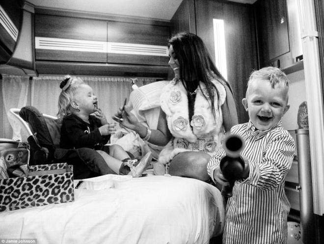 The pictures also offer an insight into traveller family life, with touching snaps of a baby taking a bath in a washing up bowl, a mother posing with her three daughters, and a pair of siblings peeking out of the window of a caravan.