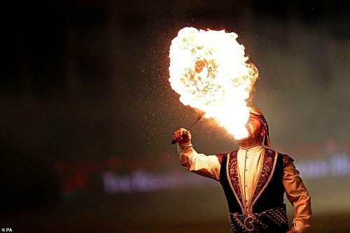 A man breathes fire during the Karabakh Horses of Azerbaijan performance. The annual show is just a short distance from Windsor Castle