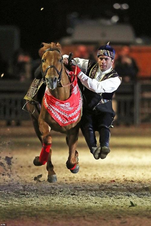 The show sees competitors taking part in a range of events from show jumping to dressage, including the Kelaghayi and the Karabakh Horses of Azerbaijan, above, forming a human pyramid on horseback