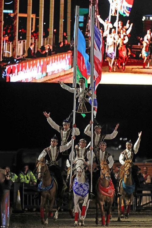 The Kelaghayi and the Karabakh Horses of Azerbaijan perform at the pageant. The show is one of the Queen's favorite events of the year