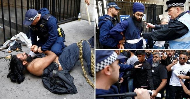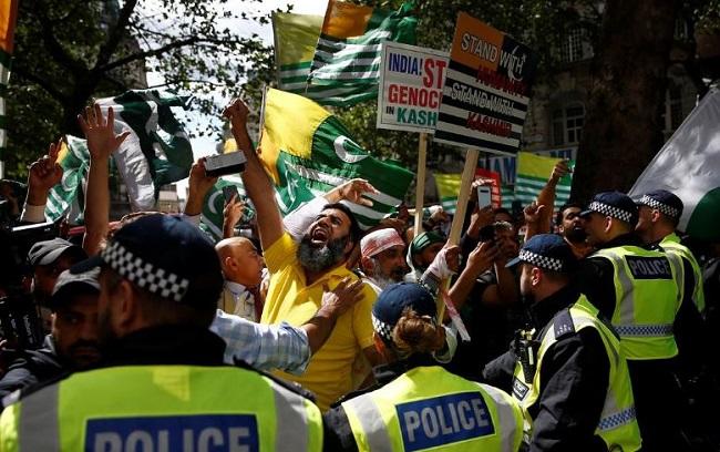 Thousands of people, many waving Pakistani and Kashmiri flags, protested outside the Indian High Commission in London on Thursday in support of the disputed Himalayan region of Kashmir.