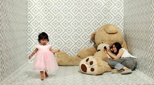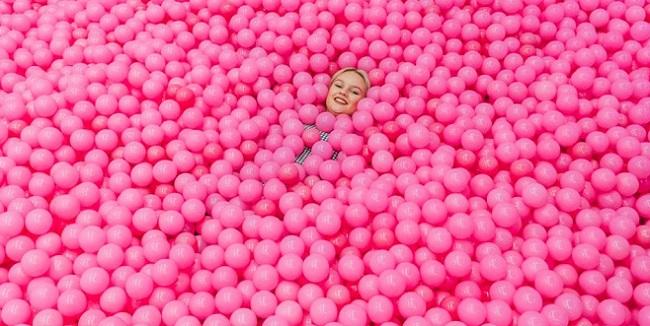 Space includes a wall of doughnuts, a big fluffy teddy bear, a giant ball pit, a 1950s diner, a confetti corner, and colored ribbons to wander through.