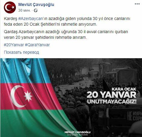 Axar.az reports that Turkish Foreign Minister Mevlut Cavusoglu wrote this on his Facebook page.