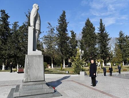 Axar.az reports that the head of state first visited the monument to the National Leader at Heydar Aliyev Park in Kurdamir and laid flowers at it.