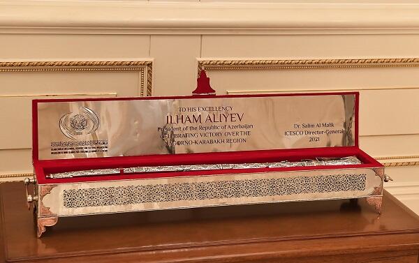 ISESCO Director General Salim bin Mohammed Al-Malik presented a gift to President of the Republic of Azerbaijan Ilham Aliyev on the occasion of the Victory.