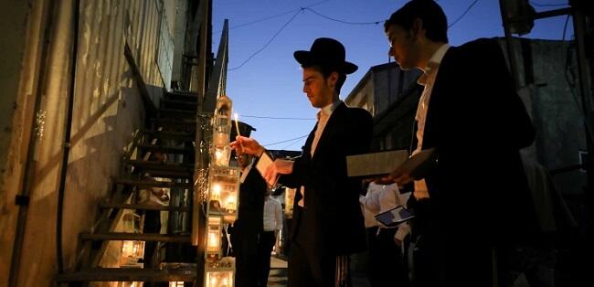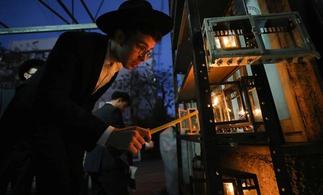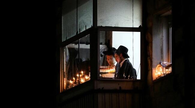 Ultra-Orthodox Jewish yeshiva students light candles on the fourth day of the Jewish holiday of Hanukkah in the ultra-Orthodox city of Bnei Brak near Tel Aviv, Israel, Wednesday, Dec. 1, 2021.
