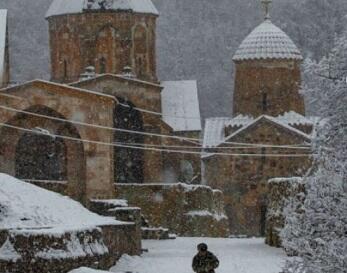 Axar.az informs that the photographer also informs the audience about the history of the temple in the sharing of winter images of the Khudavang monastery complex.