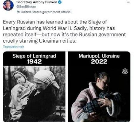 Blinken posted a collage of two photos: Leningrad in 1942 and Mariupol in 2022.