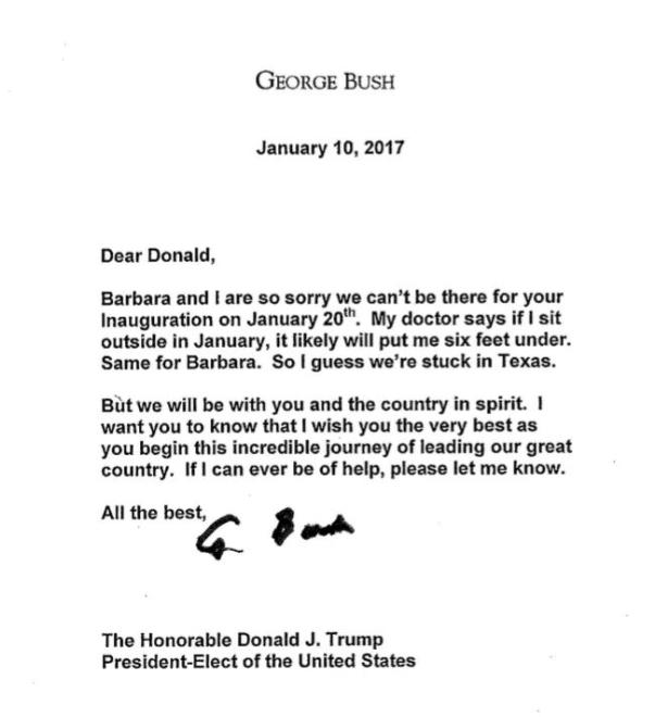 “Barbara and I are so sorry we can’t be there for your Inauguration on January 20th,” the former president wrote in a note dated Jan. 10. “My doctor says if I sit outside in January, it will likely put me six feet under. Same for Barbara. So I guess we’re stuck in Texas.”