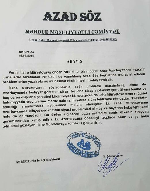 One of these organizations represents itself as an "Azad Soz" Ltd. In 15.07.2015, this organization gave one of its reliable No: 1815/72-94 certificates to the wife of Fuad Murvatov. Certificate "approves" that housewife Ilaha Murvatova has "really" faced with political pressure and death threats by government of Azerbaijan. She has a risk of being arrested, if she will return to Azerbaijan.