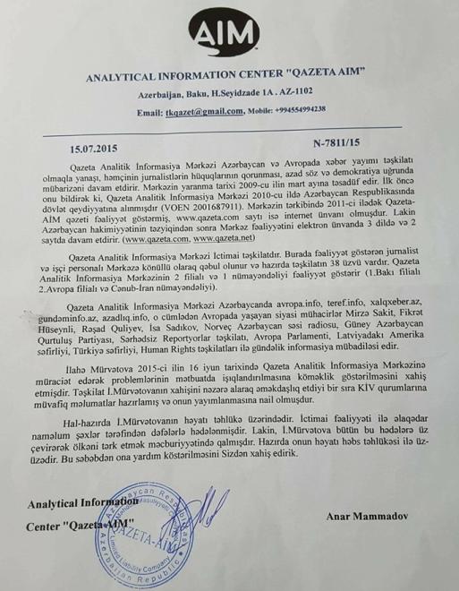 Letter was signed by chairman of Qazeta AIM Anar Mammadov.