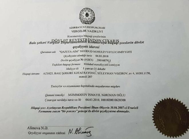 One of the organizations which produces such fake documents is Qazeta Analytical Information Center. For strenghtening the lie of Ilaha Murvatova was a journalist who was facing political pressure and "danger of death", this "reliable organization" has also sent a letter to Germany on 15.07.2015. In a certificate No: 7811/15 organization gave an information about itself: they were recorded on 2010, TIN is (2001687911), and has two websites in three languages.