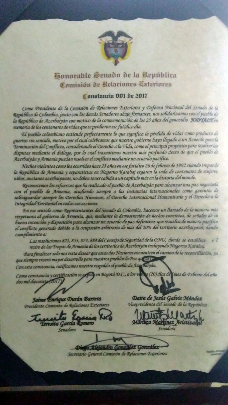 Senate of Republic of Colombia has passed a decision regarding 25th anniversary of Khojaly genocide.
