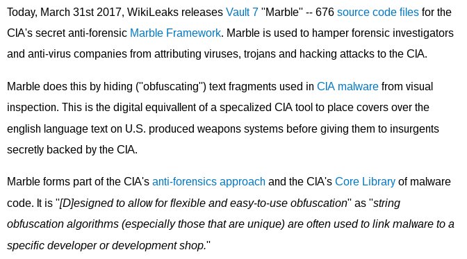 "Marble is used to hamper forensic investigators and anti-virus companies from attributing viruses, trojans and hacking attacks to the CIA."