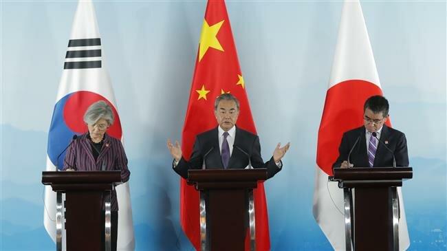 Foreign Ministers Kang Kyung-wha of South Korea, Taro Kono of Japan, and Wang Yi of China shook hands and posed for the media before sitting down to talk.