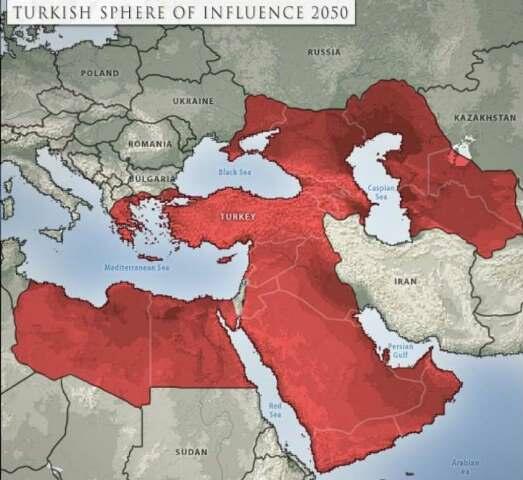 According to the map, Turkey will have influence over Greece, Southern Cyprus, Libya, Egypt, Syria, Iraq, Lebanon, Jordan, Saudi Arabia, Oman, Yemen, the Gulf countries, Georgia, Armenia, Azerbaijan, Crimea, Turkmenistan and Kazakhstan.