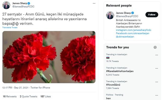 Ambassador of Great Britain to Azerbaijan James Sharp has made a post regarding the Day of Remembrance on Twitter.