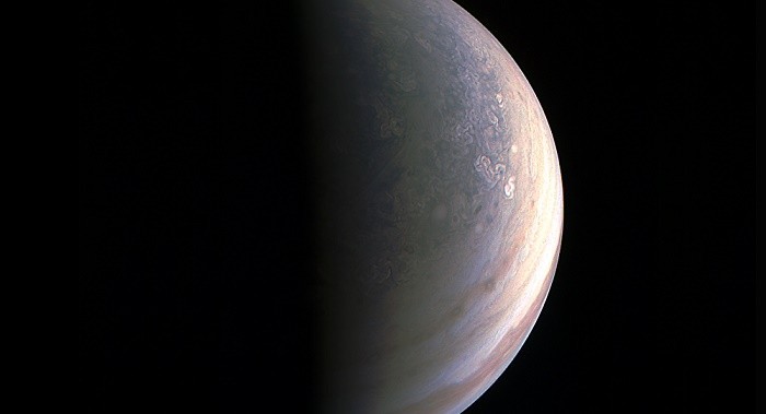 "It's bluer in color up there than other parts of the planet, and there are a lot of storms," Bolton added. "There is no sign of the latitudinal bands or zone and belts that we are used to; this image is hardly recognizable as Jupiter. We're seeing signs that the clouds have shadows, possibly indicating that the clouds are at a higher altitude than other features."