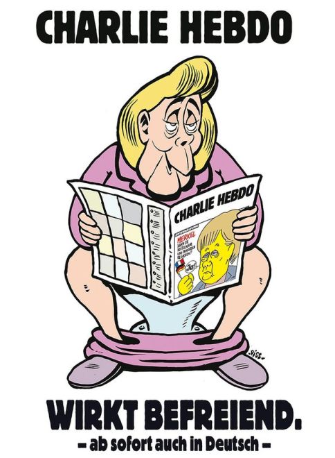 The launch publicity featured a poster showing Merkel sitting on a toilet and reading the weekly, with the slogan: “Charlie Hebdo – it’s liberating.”
