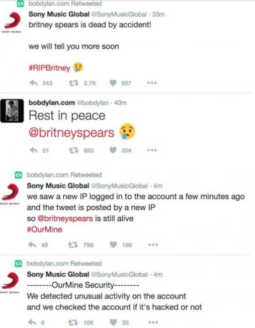 “We saw a new IP logged in to the account a few minutes ago and the tweet is posted by a new IP so @britneyspears is still alive #OurMine.”