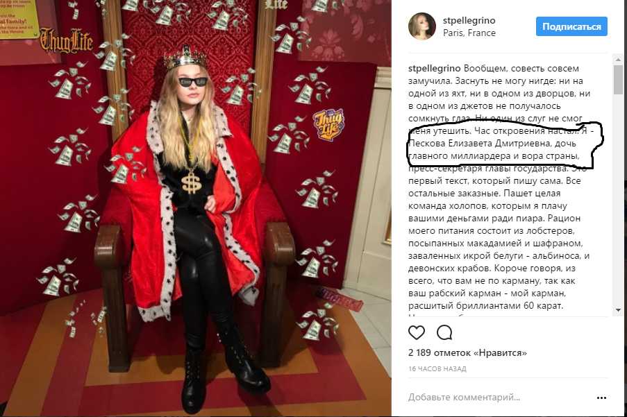 According to posts, she wrote that she doesn't wear them and does not eve know why did she buy them. She also wrote: I, Peskova Elizaveta Dmitrievna, daughter of main billionaire, thief and press secretary of the country".