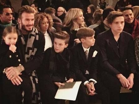 David attends in Fashion show was organized by his wife Victoria Beckham. He sat in the front row with his children and watched what was happening on the podium. The end of the show Victoria Beckham appeared on the stage sporty style.