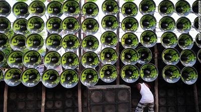 An Indian electrician arranges loudspeakers during a music festival in the city of Prayagraj.