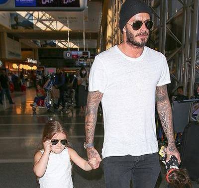 David, Victoria and their children’ wearing so fashionably in the airport. Little Harper, as always, got attention with her own style. 4 year old girl wearing black glasses, dressed white garment.