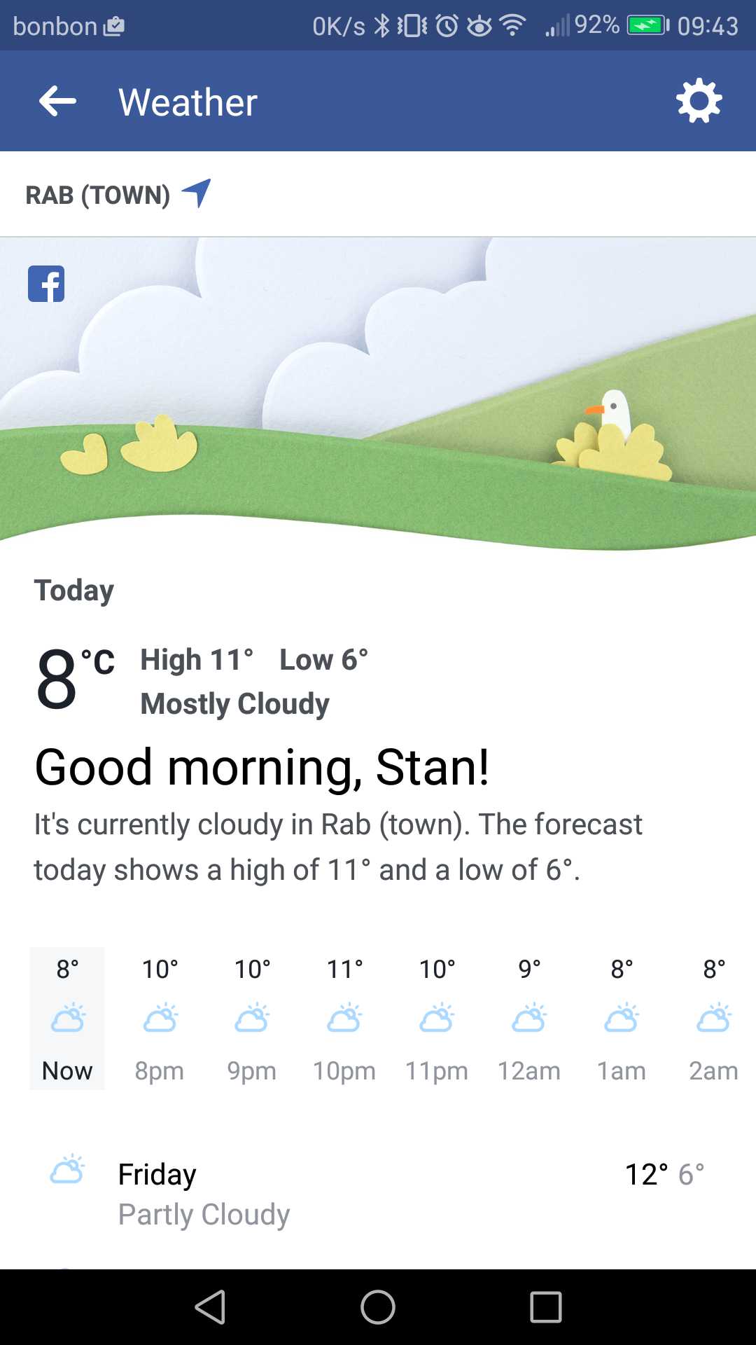 If you do see it, you'll get a rudimentary app that gives you an hour-by-hour weather forecast for the current day and a simple forecast for the next five days. You can add custom locations in the settings (the app won't work without letting Facebook to access your location), switch from Celsius to Fahrenheit, and that's pretty much it in terms of options.