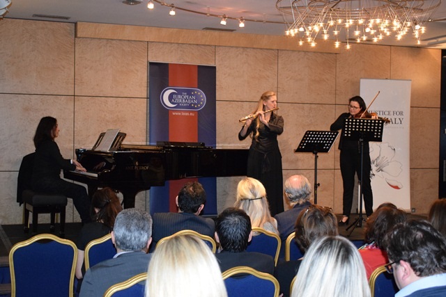 The event on 23 February was hosted in Luxembourg, a country that has experienced many invasions over the centuries – most notably twice during the 20th century – and has great solidarity with the plight of Azerbaijan. It took place in the centre of the city in the glorious Salon des roses of the Hotel Le Royal and was organised by the Benelux office of The European Azerbaijan Society (TEAS), within the Justice for Khojaly campaign. It commemorated the victims of the Khojaly massacre, which occurred on 26 February 1992. The pianist, composer and singer-songwriter Nezrin Efendiyeva, accompanied by Astrid Gallez (flute) and Marie-Carmen Suarez (violin) performed various classical and contemporary works by Azerbaijani, German, Russian and French composers.