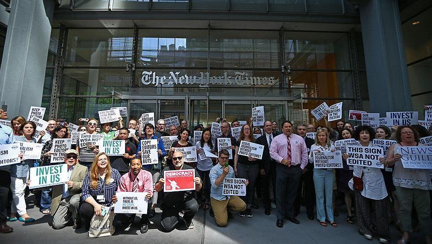 The group protested in front of the legendary newspaper’s headquarters in New York City, shouting slogans such as, “They say cutbacks, we say fight back,” and holding signs that read, “Who do you think makes sure its fit to print?”, a reference to the Times’ slogan “All the News That’s Fit to Print.”’