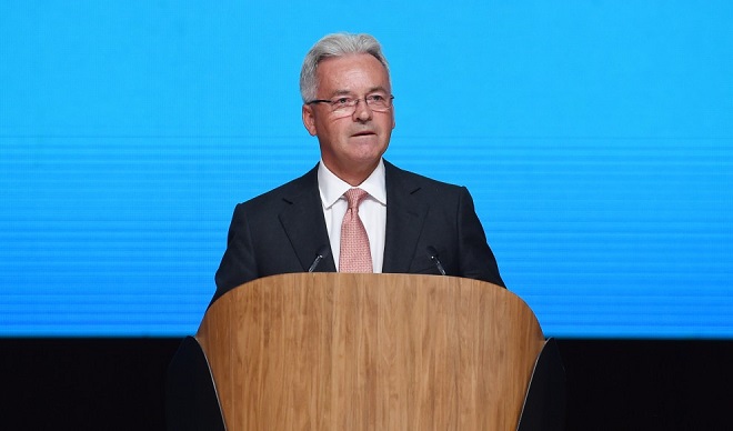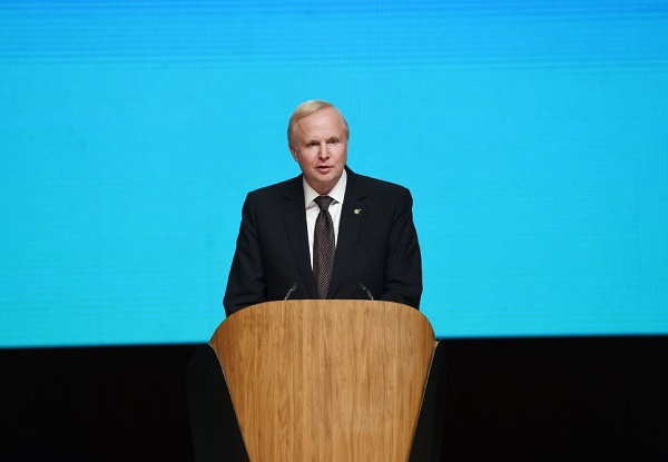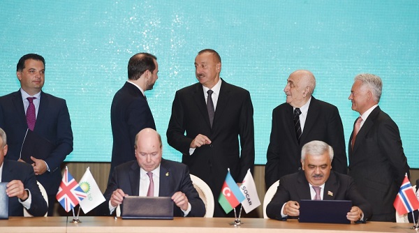 A ceremony is held for an agreement on the joint development of the Azeri, Chiraq, Gunashli fields and the oil production sharing in the Azerbaijani sector of the Caspian Sea on September 14 at the Heydar Aliyev Center in Baku.
