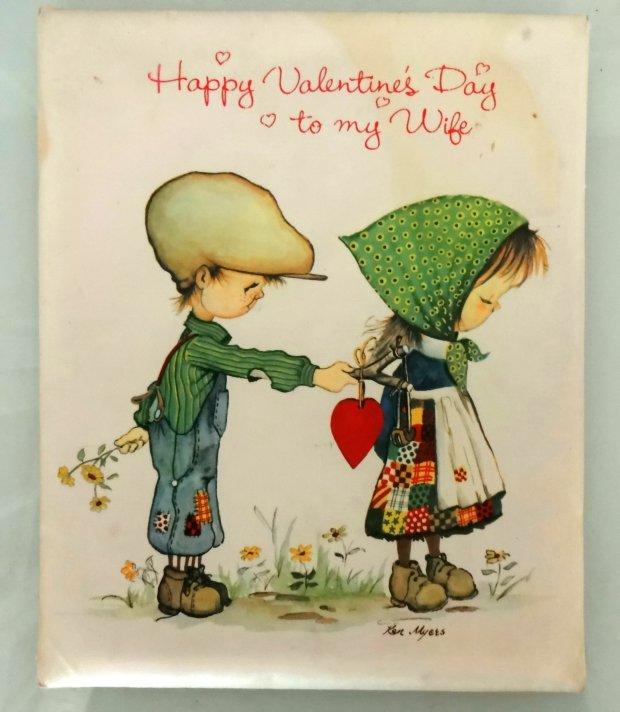His card, which reads ‘Happy Valentine’s Day to my Wife’, shows a boy offering his beloved a heart tied to a catapult. Despite his romantic efforts, he and Valerie, who have five children, 12 grandchildren and two great-grandchildren, will be celebrating Valentine’s day in a low key style, by simply having a meal and exchanging cards. Ken said: ‘My old card is brimming with messages but there’s room for many more. It’s got plenty of years left in it yet.’ Valerie, 67, added: ‘I do love the card and it’s become really special to me over the years. It’s in very good condition. ‘I always make sure it’s in a safe place. One year, I put it in such a safe place that I couldn’t find for a while afterwards.