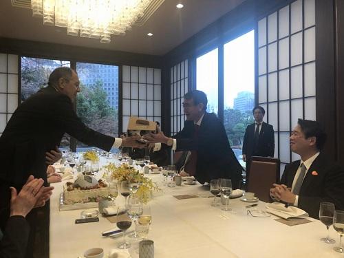 Lavrov returned the favor by giving Kono an official ball of the 2018 FIFA World Cup, which is set to be held in Russia this summer.
